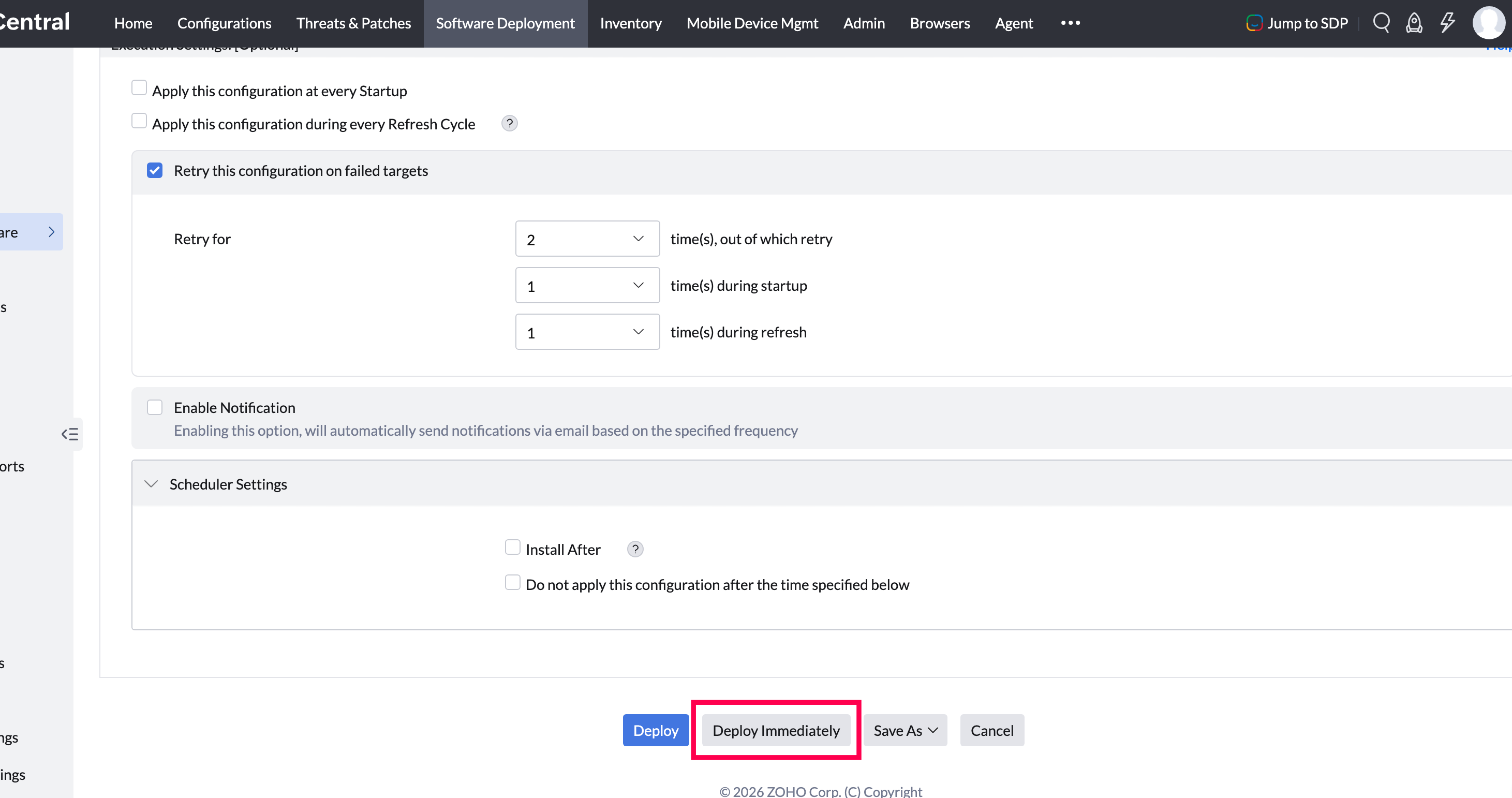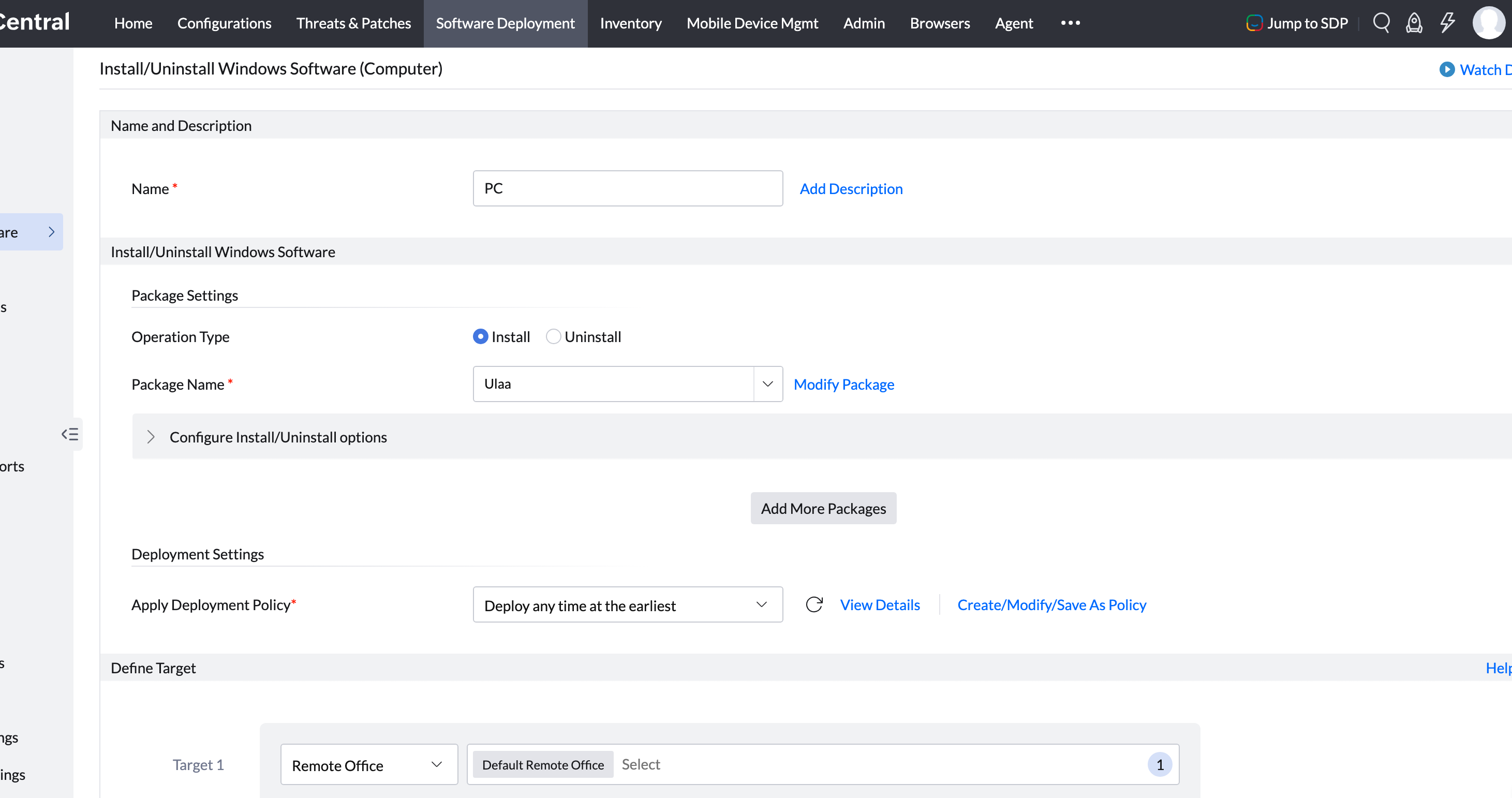 Enter your preferred name, choose the package from the dropdown menu, set the deployment policy to “Deploy anytime at the earliest” then, choose the devices you want to deploy and select "Deploy Immediately" as shown below :