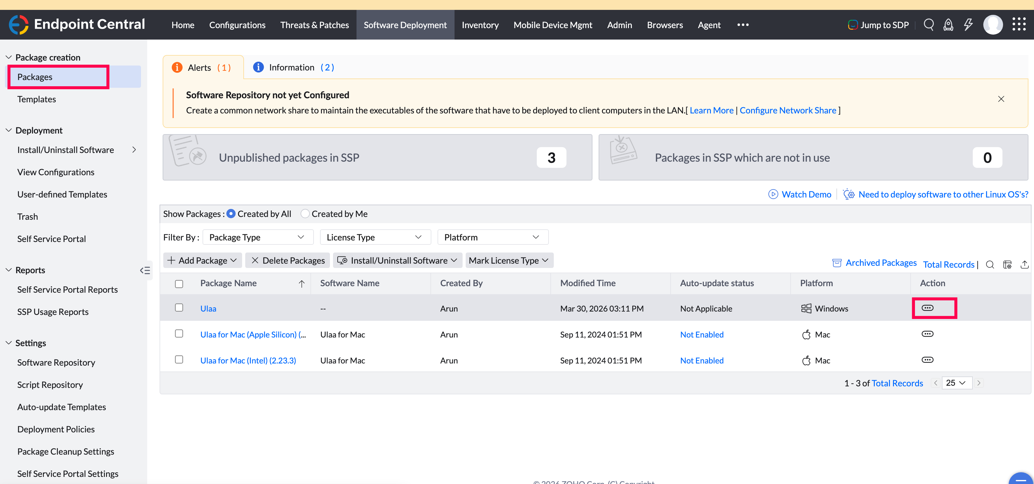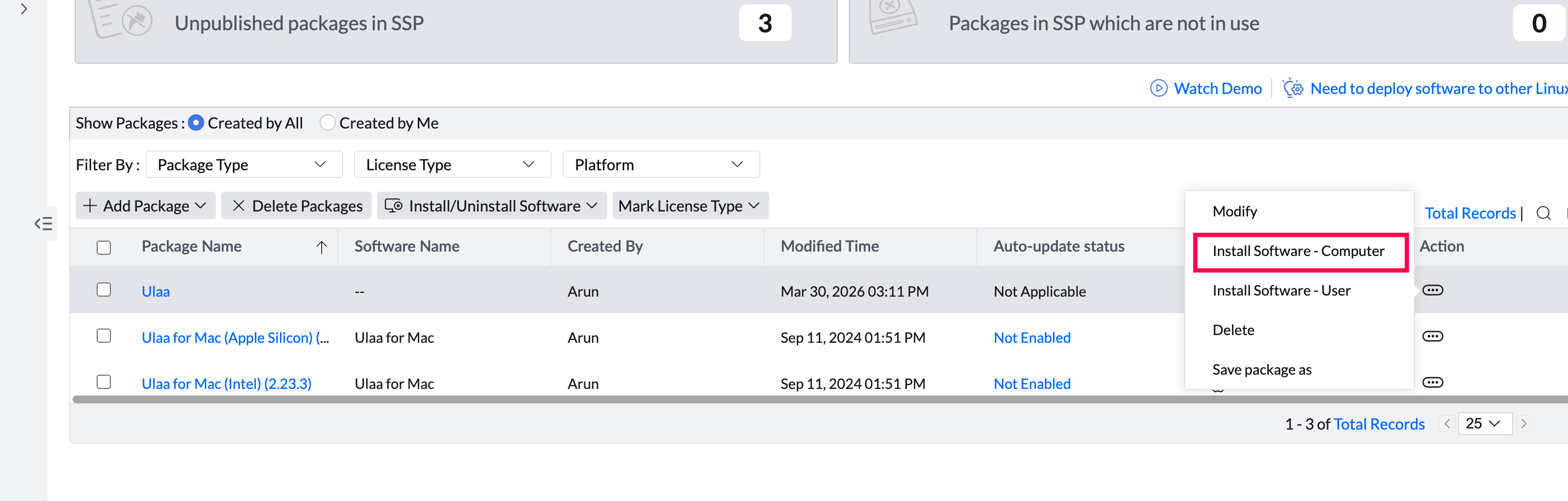 Navigate to the Packages section again and select the package you created. Then, click on the three dots (as shown in the screenshot below) and choose "Install Software – Computer" .
