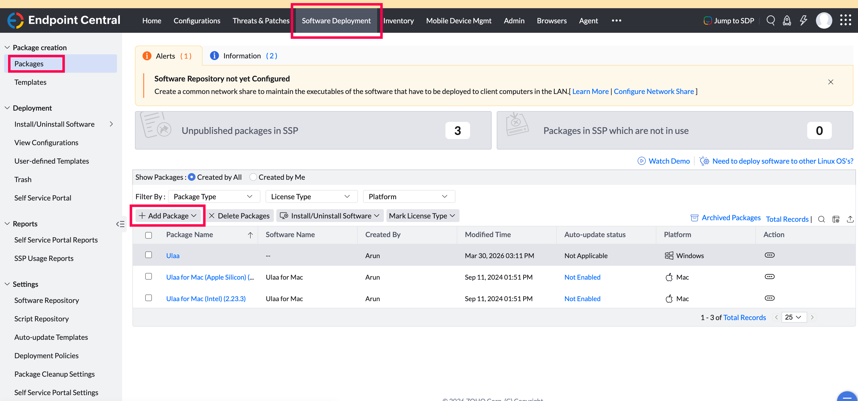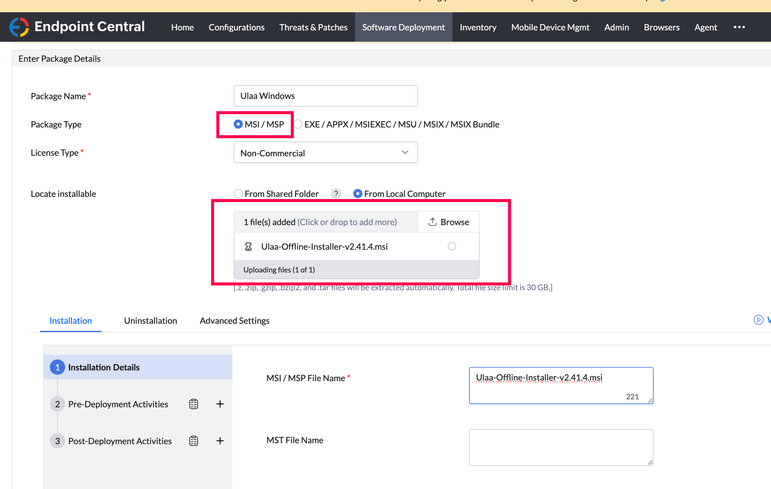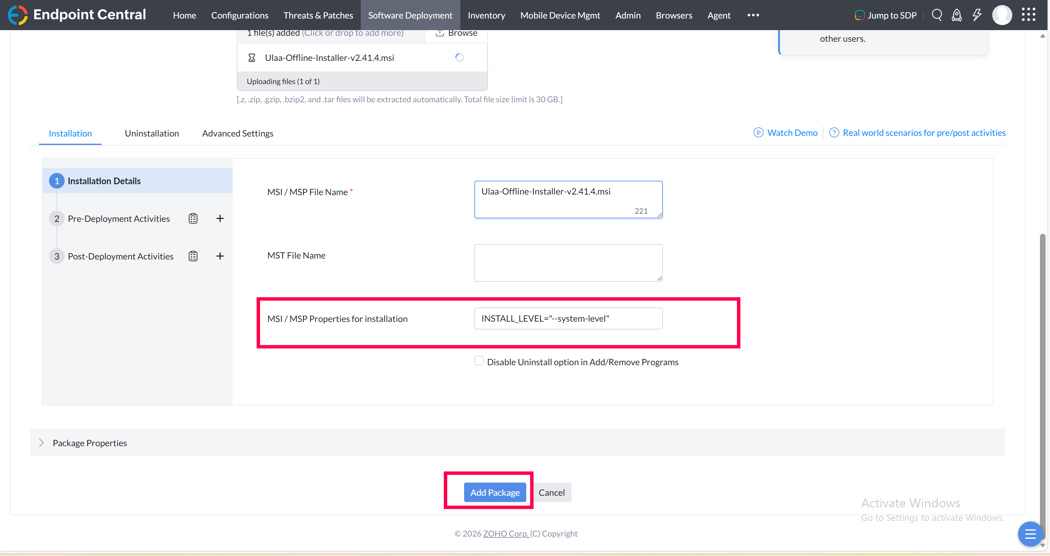 Select the package type as MSI/MSP to ensure Ulaa is installed silently by default. Then, upload the Ulaa MSI file downloaded from our official website, fill in the required details, and click on "Add Package" button.